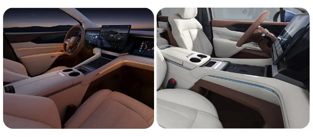 The Xia adopts a 2+2+3 three-row, seven-seat layout. Up front, it offers a 15.6-inch floating central control screen, a 12.3-inch passenger entertainment screen, and a 15.6-inch overhead central display. Additional features include wireless phone charging, dual cup holders, and a storage compartment beneath the island console.
