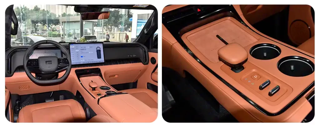 In terms of the powertrain, the vehicle employs an extended-range hybrid system consisting of a 1.5T engine paired with an electric motor. The engine produces a maximum output of 108 kW. Single-motor variants are equipped with an electric motor delivering 150 kW, while dual-motor versions feature front and rear motors rated at 150 kW and 200 kW respectively, resulting in a combined system output of 350 kW. The battery pack has a capacity of 44.5 kWh, providing a CLTC-rated pure electric range of 215 km. In addition, the vehicle is equipped with an air suspension system offering a height adjustment range of up to 140 mm.