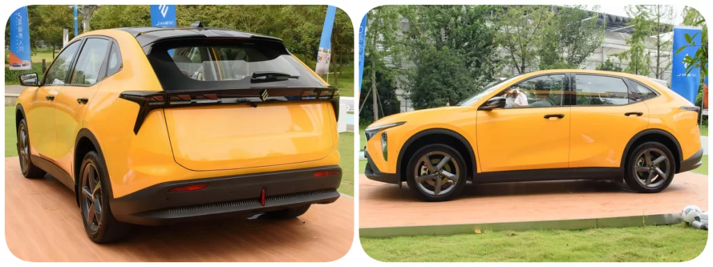 With a body length of 4640 mm and a 2770 mm wheelbase, the JMEV 05S maintains an ideal wheelbase-to-length ratio, offering 900 mm of rear legroom. Glossy black side skirts with yellow accents and 19-inch black alloy wheels reduce unsprung mass, lowering body roll by 12% during cornering. The floating roof design, pronounced character lines, and traditional mechanical door handles contribute to a strong three-dimensional visual effect.