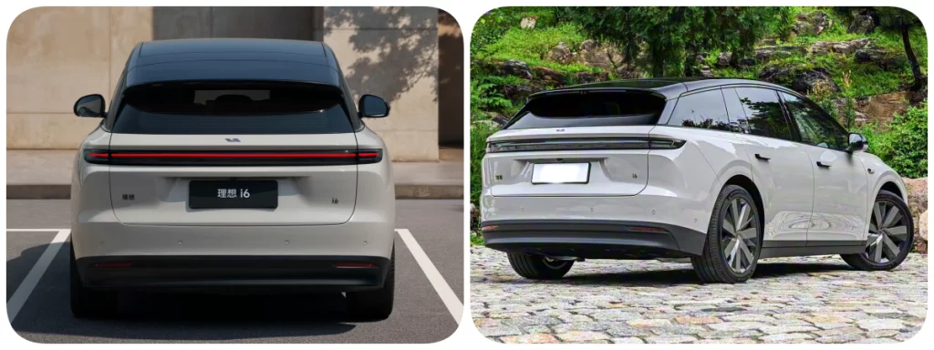 From the side, the Li6 maintains the Li8’s design language of short overhangs and a long wheelbase. The roofline flows smoothly, with a subtle fastback effect created at the D-pillar, giving it a hatchback-like character. Dimensions for the Li6 measure 4950/1935/1655 mm (L/W/H) with a 3000 mm wheelbase—just 50 mm shorter than the Li8. It offers 20-inch or 21-inch low-drag wheels and includes factory-custom roof rails that raise the height to 1735 mm when deployed.