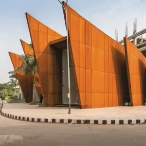 In architectural use, the stable oxide layer (approximately 50–100 μm thick) forms naturally over time, giving the steel a service life of over 30 years and a distinctive reddish-brown patina. This makes 09CuPTiRE-A ideal for aesthetic facades, decorative panels, and outdoor sculptures, where both structural performance and visual appeal are required.